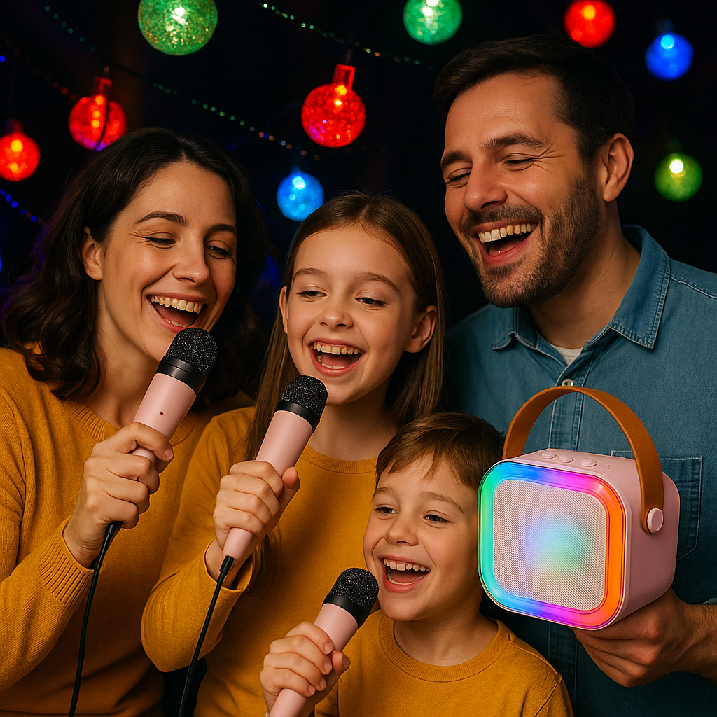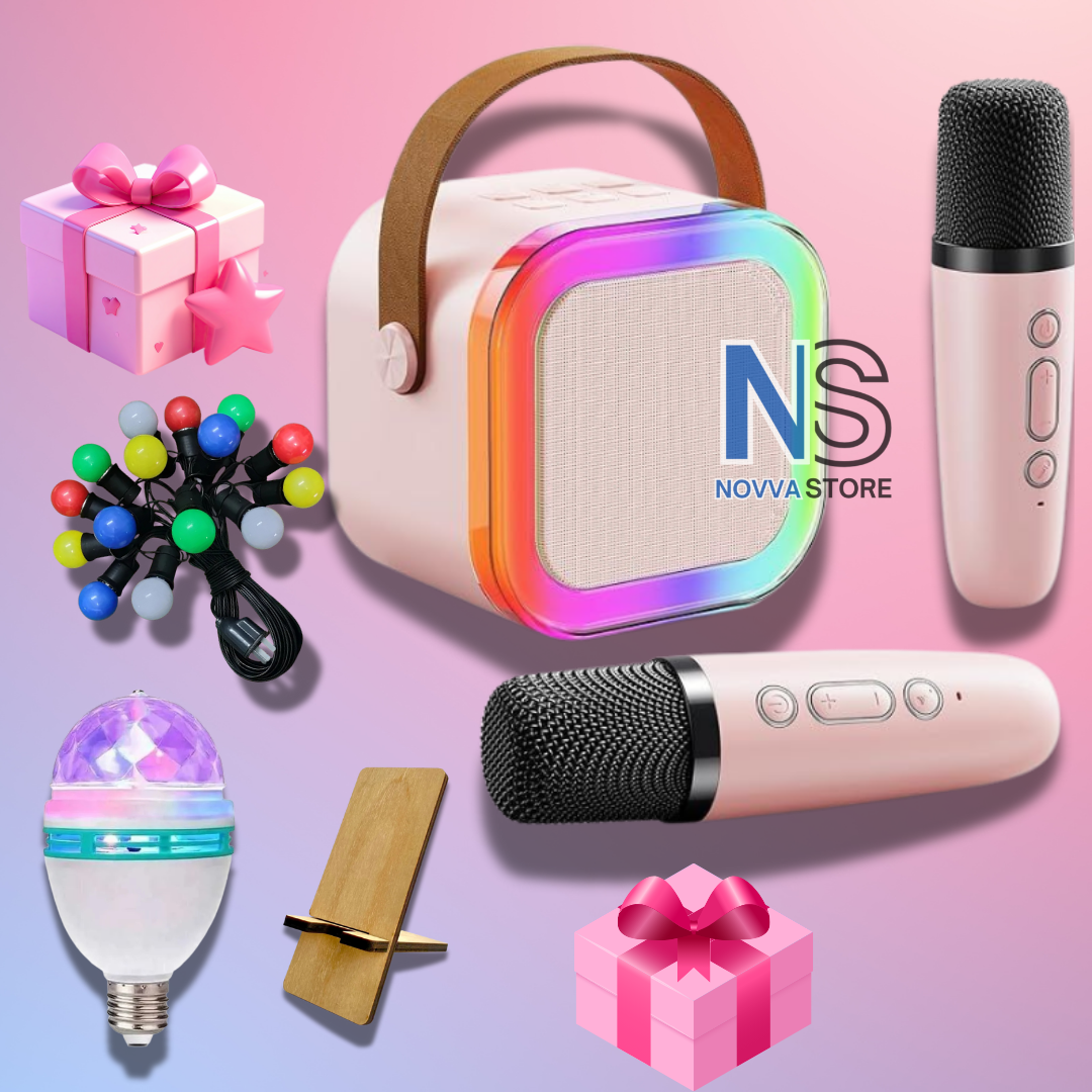 ¡Todo lo que necesitás para armar tu propio karaoke y llenar tu casa de música, luces y diversión! 🎶 Parlante con 2 micrófonos + foco boliche + guirnalda de luces LED + soporte para celular.